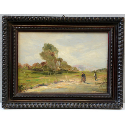 "Paesaggio con armenti" olio su cartone (cm 22.5x32.5) Firmato in basso a destra. In cornice