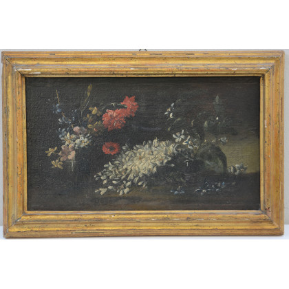 Antico dipinto raffigurante natura morta con fiori, olio su tela(cm 27x42)in cornice (difetti e restauri)
