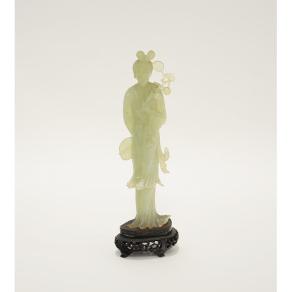 Dama dalle lunghe vesti con ramo di frutti, in pietra dura verde, base in legno (difetti) Cina, sec. XX (h. 22 cm.)
