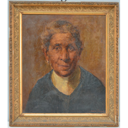 "Impressione, ritratto" 1928 A.VI, olio su compensato (cm 49x41) Firmato e datato in basso a destra. Al retro: firmato, titolato e datato. In cornice di legno e pastiglia dorata (difetti)