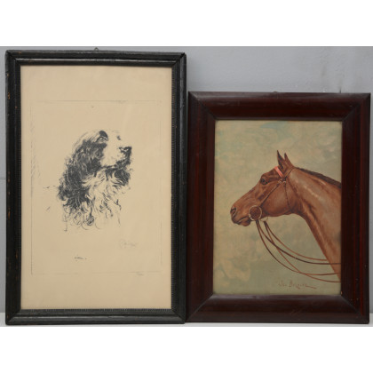 Lotto composto da un dipinto raffigurante testa di cavallo e una litografia raffigurante cane, in cornici
