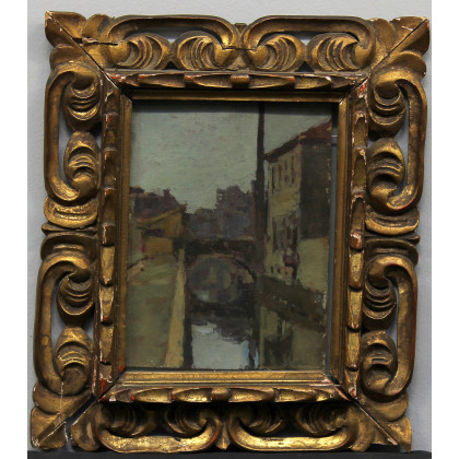 "Ponte dell’Ospedale" olio su tela applicata su tavoletta (cm 20x15) Inscritto e titolato al retro. In cornice (difetti)