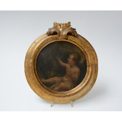 Antico frammento raffigurante San. Giovannino, olio su cartone pressato (d. cm 21) In cornice (difetti e restauri)