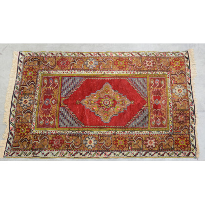 Tappeto Mudjiur, Anatolia, inizio secolo XX. Disegno a medaglione su fondo rosso. Grande bordura con rose e gigli su fondo nocciola (cm 155x103) (difetti)