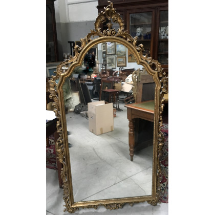 Specchiera con cornice in legno intagliato e dorato con decoro a volute (cm 86x168) (difetti)