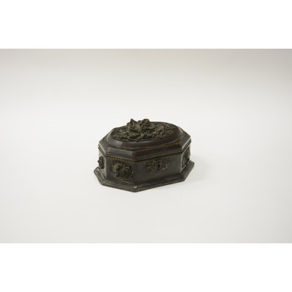 Cofanetto portagioie di forma ottagonale in legno rivestito in cuoio e decorato con applicazioni in rame raffiguranti putti alati, personaggi e composizioni con fiori e strumenti musicali (cm 28x9x16) sec. XIX (difetti)