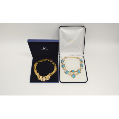 Bijoux Cascio e anonimo. Lotto composto da due collier in metallo dorato entrambi rifiniti con strass, uno anche con materiale plastico ad imitare il turchese