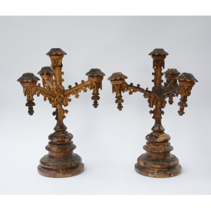 Coppia di candelabri a quattro fiamme di gusto neogotico in legno dorato, basamento tornito e bracci intagliati ad archetti pensili (h cm 60) (difetti e restauri)
