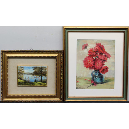 Lotto di quattro dipinti raffiguranti un vaso con fiori e scorci fioriti, autori e misure diverse. In cornici
