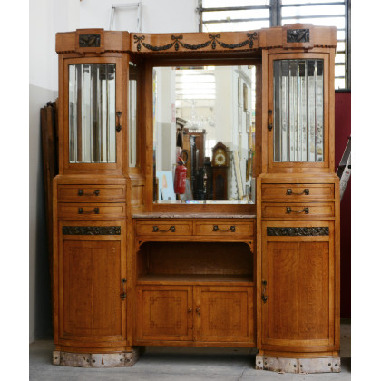 Credenza Liberty a due corpi in legno lastronato e filettato, parte superiore a due ante a vetri, specchio centrale e quattro cassetti, parte inferiore a quattro ante, cassetto, vano e pianetto in marmo, decorata da placche e fregi in metallo, inizio secolo XX (cm 200x236x58)(difetti)