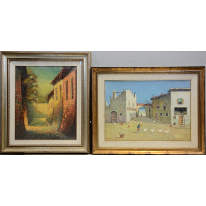 Lotto composto da tre dipinti raffiguranti scorci, autori e misure diverse. In cornici (difetti)