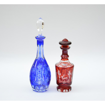 Manifattura di Boemia. Lotto di due bottiglie in cristallo molato nei toni del rosso e del blu (lievi difetti)