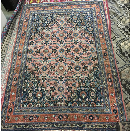Tappeto Malayer, Persia, metà secolo XX. Decoro Herati per il campo color rosa e gli angolari color blu (cm 194x133)(difetti)