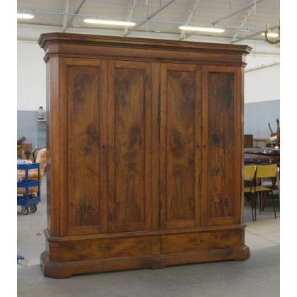 Armadio a quattro ante lastronate in radica, due cassetti in linea nella parte inferiore (cm 220x224x60). (Difetti)