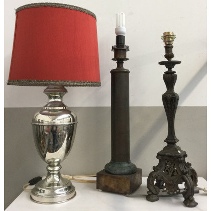 Lotto di tre lampade da tavolo a una luce di fatture differenti (difetti e mancanze)