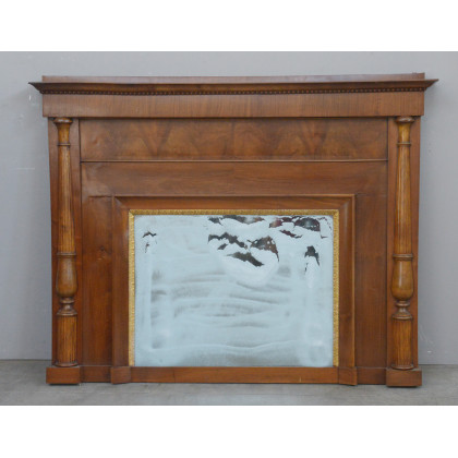 Caminiera in noce con montanti a mezza colonna scanalata e cornice interna con fregi dorati, secolo XIX (cm 143x112)