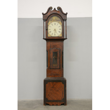 Pendola a torre con cassa in legno dolce parzialmente dipinto, quadrante decorato da fiori e scena di caccia (cm 55x218x27) (difetti e restauri)