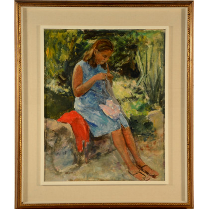 "Mia nipote in giardino" olio su cartone telato (cm 50x40) Firmato in basso a sinistra. Al retro: titolato. In cornice