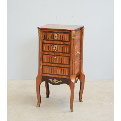 Comodino di forma sagomata lastronato in bois de rose e bois violet, filettato e intarsiato a motivi geometrici. Due cassetti e antina ribaltabile sul fronte. Applicazioni in bronzo dorato (cm 41x82x34) (difetti)