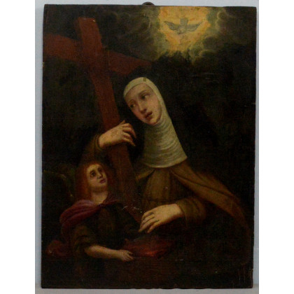 Ignoto del secolo XVIII "Santa con angelo" olio su tavola (cm 49,5x37,3) (difetti e restauri)