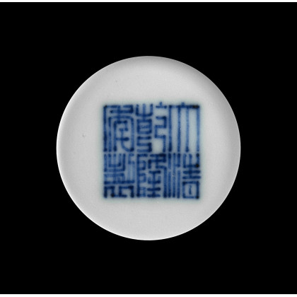 Ciotola in porcellana bianca e blu decorata con motivo di fiori e foglie di loto a volute, marchio apocrifo Qianlong alla base Cina, secolo XIX/XX (d. 13 cm.)