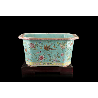 Fioriera di forma ottagonale in porcellana Famiglia Rosa a fondo turchese con decoro di fiori e farfalle, base in legno (mancanze) Cina, inizio secolo XX (l. 25 cm.)