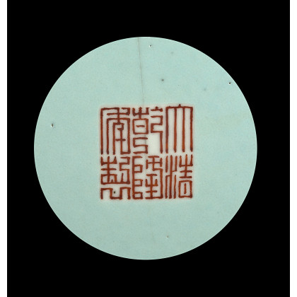 Grande vaso in porcellana Famiglia Rosa, con doppie anse a guisa di creature fantastiche stilizzate, decorato con scena tratta dal "Romanzo dei Tre Regni" (Sanguo Yanyi), e motivi floreali entro riserve, contornate da simboli Taoisti e Buddhisti, pipistrelli e motivi geometrici su fondo turchese, alla base marchio apocrifo Qianlong (difetti) Cina, secolo XIX (h. 70,5 cm.)