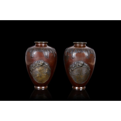 Coppia di vasi in bronzo decorati in rilievo con fanciullo (lievi difetti) Giappone, periodo Meiji (1868-1912) (h. 20 cm.)