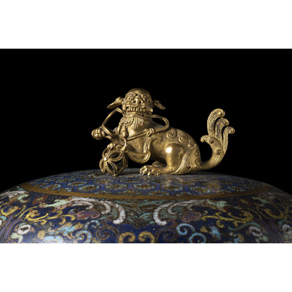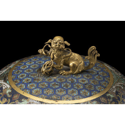 Coppa biansata con coperchio in metallo cloisonné, dalla forma arcaica dou, decorata a maschere taotie e motivi geometrici in toni vividi, il coperchio sormontato da leone buddhista con palla di broccato in bronzo dorato, alla base marchio Jingtai Cina, secolo XVIII (h. 38 cm.)