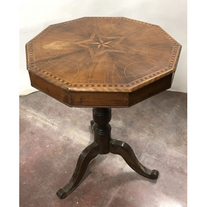Tavolino con piano decagonale intarsiato filettato con cassetto nella fascia gamba tornita terminante a tre piedi mossi (cm 5774x57)(gravi difetti)