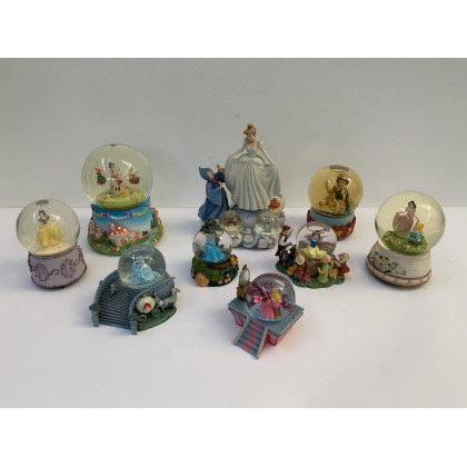 Cartone contenente numerosi snowglobe Disney, misure differenti (difetti)
