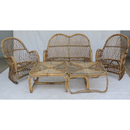 Fornitura da veranda composta da un divano a due posti, due poltrone e due tavolini in manao e giunco. Esecuzione gervasoni, Italia, anni 80 (gravi difetti)