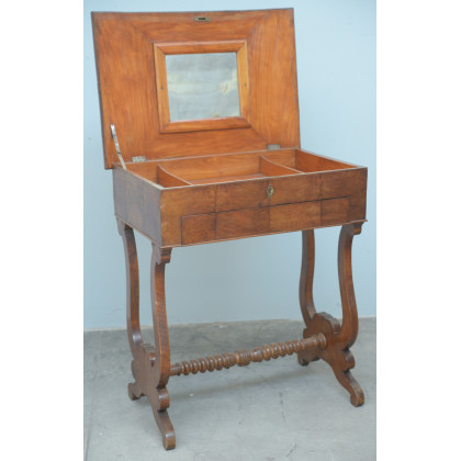 Tavolino da lavoro lastronato in noce e radica di noce, piano apribile celante vani e specchio, cassetto nella fascia, gambe sagomate riunite da traversa tornita, secolo XIX (cm 70x82x47) (difetti)