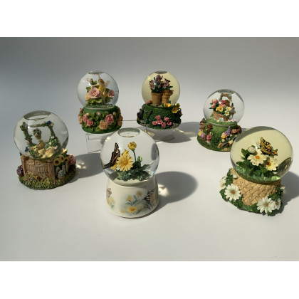 Gruppo di sei boules de neige con carillon a tema floreale. Vetro, porcellana e resina policroma (h cm 15) (lievi difetti)