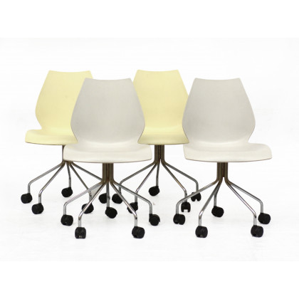 Quattro sedie con rotelle modello "Maui". Produzione Knoll, USA, anni '70. Polipropilene bianco e beige, struttura in acciaio cromato. Marcate sotto la base. (cm 55x77x52) (lievi difetti)