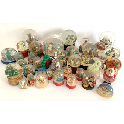 Cartone contenente numerosi souvenir boules-de-neige, soggetti e misure differenti, alcuni con carillon (difetti e mancanze)