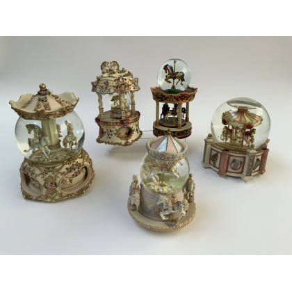 Gruppo di cinque carillon a boule de neige a tema giostra di cavalli. Vetro e resina policroma (h max cm 26) (lievi difetti)