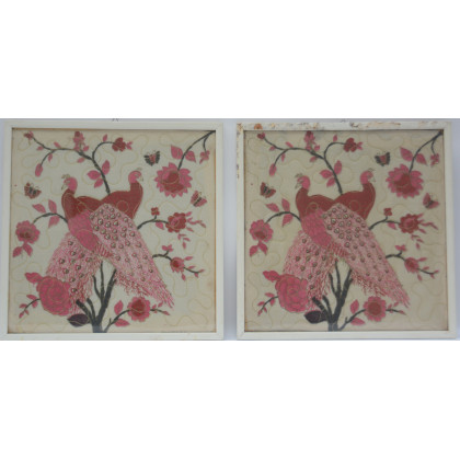 Lotto composto da quattro ricami su tessuto raffiguranti "Uccelli" (cm 40x40) In cornici (difetti)