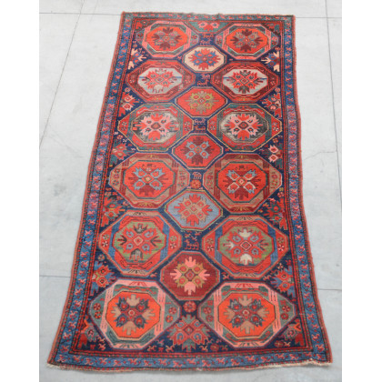 Tappeto Loristan, Persia, inizio secolo XX. Decoro con Gul policromi su fondo blu con motivi animati. (cm 257x115) (difetti e rapature)
