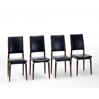 Lotto composto da quattro sedie modello "S81". Produzione Tecno, Varedo, 1958. Metallo cromato e verniciato nero, legno massello di palissandro indiano e vinilpelle nera. (cm 42x95x55) (lievi difetti)