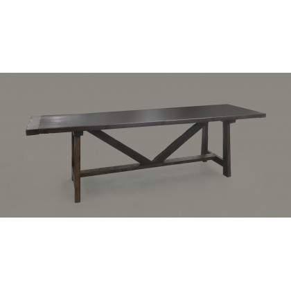 Antico tavolo ''fratino'' in legno di rovere con sostegni raccordati al centro della traversa (cm 247x73x70) unito ad un piano in cristallo (cm 260x110) (difetti)