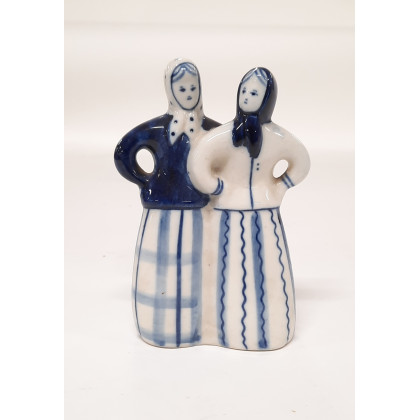 Manifattura russa Scultura in ceramica smaltata sotto vetrina dei toni del bianco e del blu raffigurante due donne in abiti tradizionali. Russia, anni '30. Marcate sotto la base. (h cm 14)