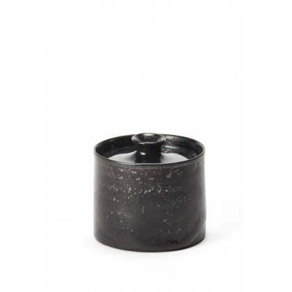 Contenitore con coperchio in ceramica viola smaltata sotto vetrina. Faenza, secolo XX. Firmato sotto la base. (h cm 9; d cm 10,5)