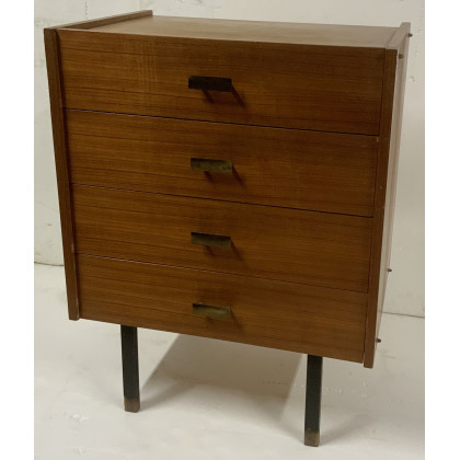 Cassettiera in legno a quattro cassetti, maniglie e piedini in metallo. Italia, anni '60. (cm 64x85x45) (difetti)