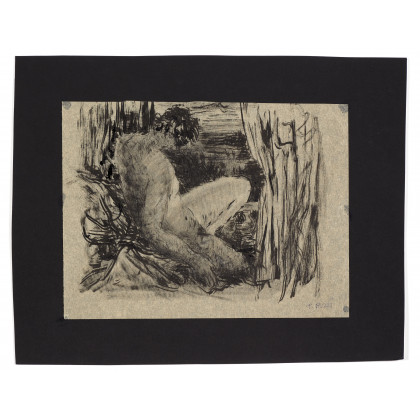 Disegno con figura semi sdraiata raffigurata di tre quarti di spalle, affacciata su paesaggio inquadrato da due cortine di tessuto. Italia, s.d. Inchiostro di china su carta da spolvero. Firmato in basso a destra. Incollato su cartoncino nero. (cm 18,8x24,8) (lievi difetti) Provenienza Collezione privata, Torino