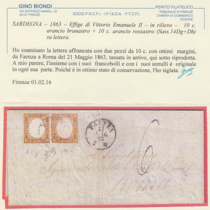REGNO D'ITALIA 1863 (21 mag.) Lettera da Faenza, via Fano, per Roma affrancata per 20c. con 2 esemplari tipo "Sardegna" di tinte leggermente diverse Cert. G. Biondi Cover