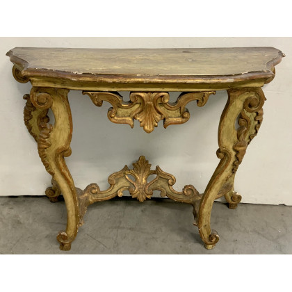 Antica console di forma mossa in legno intagliato, laccato e dorato. Fascia, gambe e traversa decorate a foglie e volute, piedi terminanti a ricciolo (cm 107x85x43) (difetti e restauri)