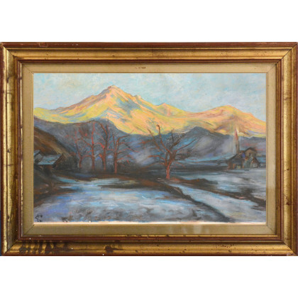 Ignoto "Paese di montagna" pastelli colorati su carta (cm 31x47) Siglato in basso a sinistra. In cornice (difetti)