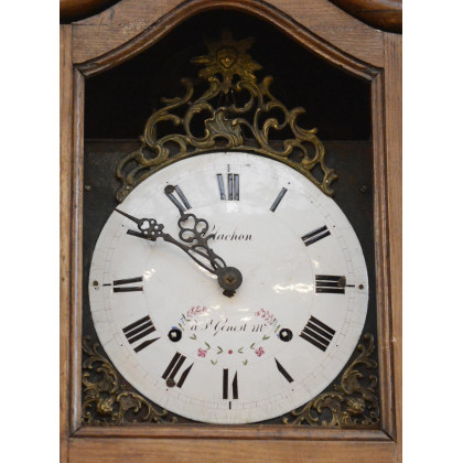 Orologio a cassalunga del tipo Morbier con cassa in legno bombata. Francia epoca metà XIX Secolo. Movimento a due treni con suoneria delle ore e mezze su campanello. Misure h cm 221 (difetti)