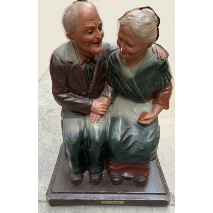 Scultura in gesso policromo raffigurante coppia di anziani. Francia, inizio secolo XX. Recante targhetta metallica "Hein! de notre temps.par Mélani e firmata al retro "J.B - Paris, 598, Deposé",. (cm 25,5x38x16) (difetti e mancanze)